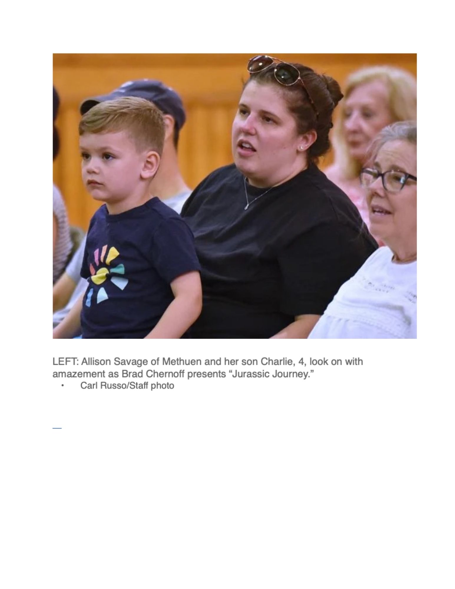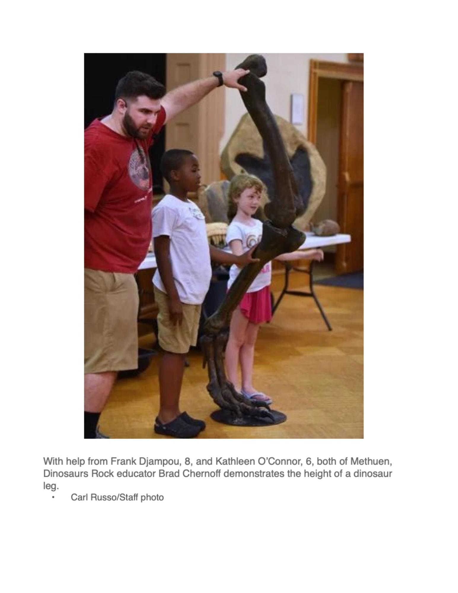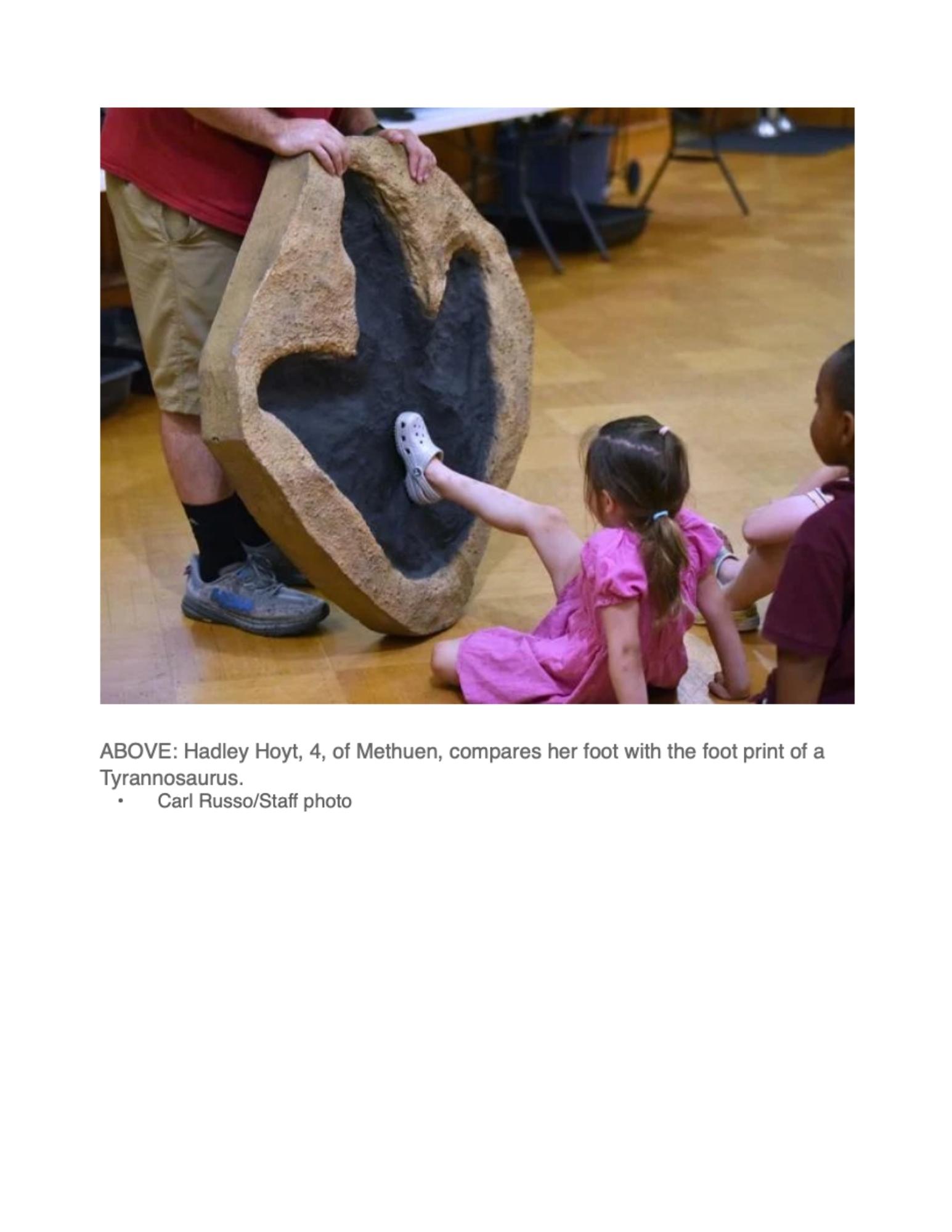 News article featuring a dinosaurs Rock instructor placing a triceratops horn on guest at this Library Program